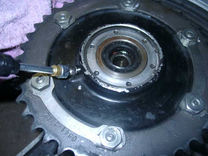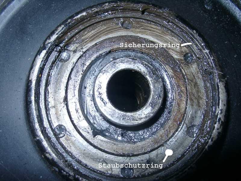 bis das Fett aus den Bohrungen des Staubschutzringes austritt. Nur zwei der Löcher sind durchgebohrt ! |